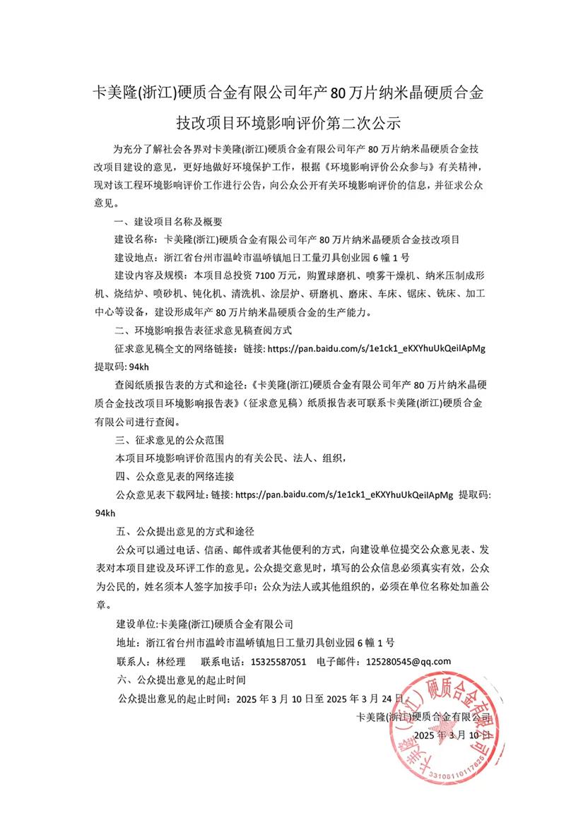 卡美隆(浙江)硬質(zhì)合金有限公司年產(chǎn)80萬片納米晶硬質(zhì)合金技改項目環(huán)境影響評價第二次公示